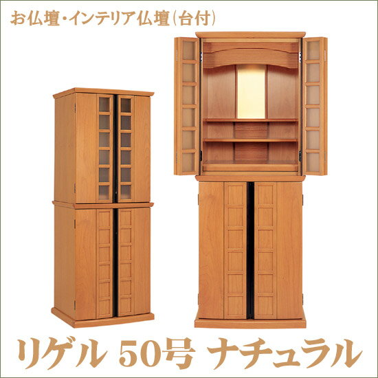 渋めのデザインながら、中央のすりガラスからご本尊がほんのりと透けて見える、 現代感覚のお仏壇です。  明るいナチュラル色です。   ■商品名  リゲル 50号 ナチュラル [インテリア仏壇(台付)] ■商品詳細 材質 アルダー材、ガラス(環境対策塗料使用) サイズ 50号 H151 x W57 x D47cm ダウンライト付き下台引き出し2杯スライド棚付きお手入れ6点セット セット内容 毛ばたき、お仏壇拭きクロス、香炉灰、つや出しクリーナー、 ミニローソク、お線香 ※香炉灰、ミニローソク、お線香は、画像と異なる同等品になる場合がございます。 ■送料 送料無料サービス (お買い上げ5,000円